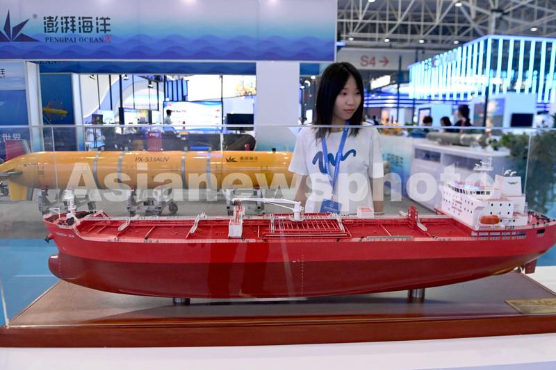 图片说明:2023年6月28日,山东青岛世纪博览城,一位参观者在观看举行货轮模型。