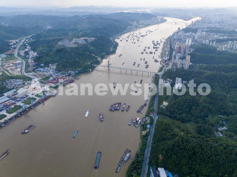 图片说明:2023年6月28日,在广西梧州市区西江段水域,众多货轮来来往往,一派繁忙景象。