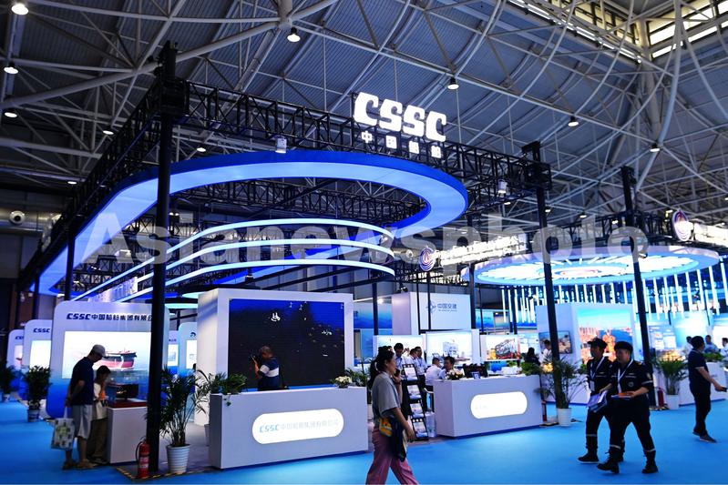 图片说明:2023年6月28日,山东青岛世纪博览城,参观者在中船展台前参观。