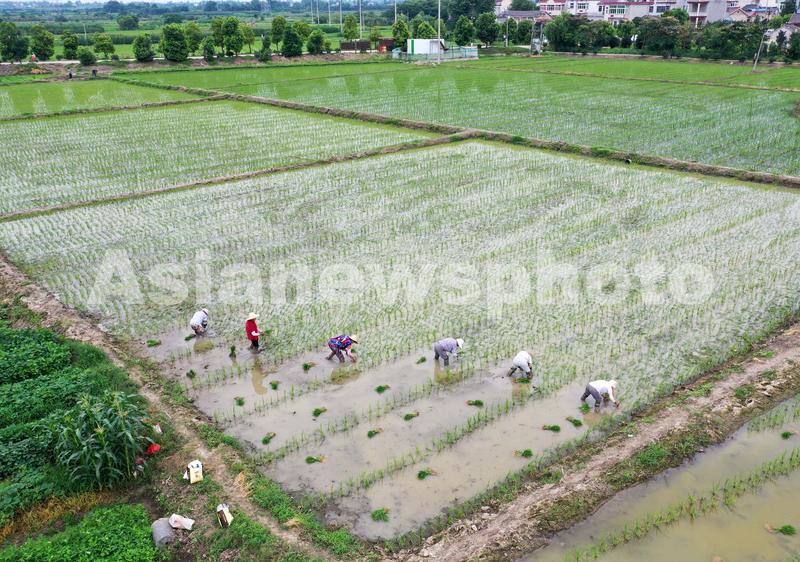 图片说明:2023年7月3日,在安徽省巢湖市中垾镇三圩村,农民在田间栽插水稻秧苗。