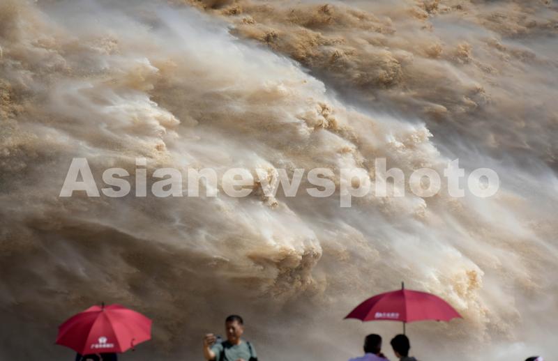 2023年7月5日,游客观看黄河小浪底水库排沙出库。 当日,黄河小浪底水库开始排沙,裹挟着泥沙的混浊水流从小浪底出水口排沙洞喷涌而出,场面壮观。
