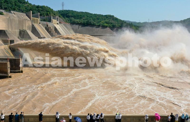 2023年7月5日,游客观看黄河小浪底水库排沙出库。