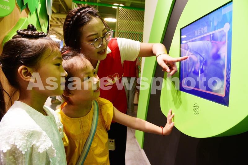 图片说明:2023年7月5日,在江苏省镇江市科技馆,江苏大学志愿者为光华朱方路社区的小朋友讲解“种子的旅行”弹射传播游戏。