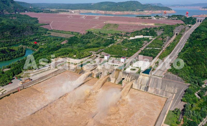 2023年7月5日,游客观看黄河小浪底水库排沙出库。 当日,黄河小浪底水库开始排沙,裹挟着泥沙的混浊水流从小浪底出水口排沙洞喷涌而出,场面壮观。