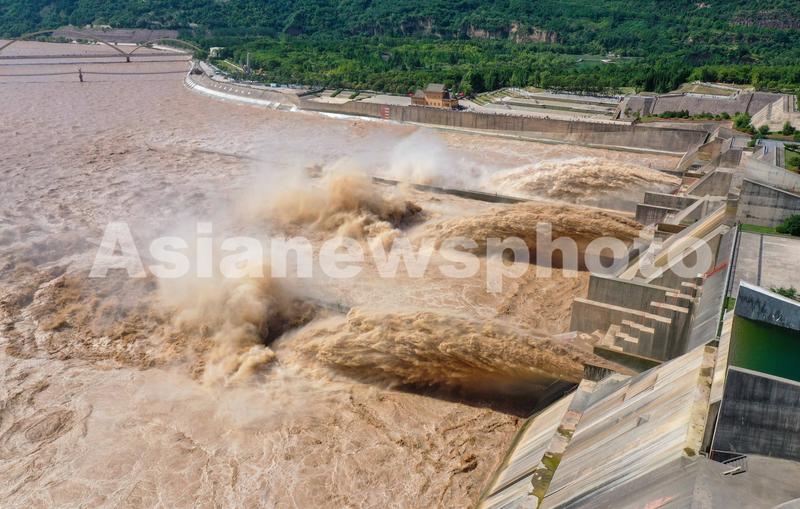 2023年7月5日,游客观看黄河小浪底水库排沙出库。 当日,黄河小浪底水库开始排沙,裹挟着泥沙的混浊水流从小浪底出水口排沙洞喷涌而出,场面壮观。