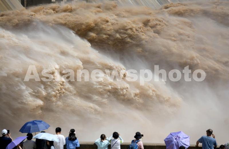 2023年7月5日,游客观看黄河小浪底水库排沙出库。
