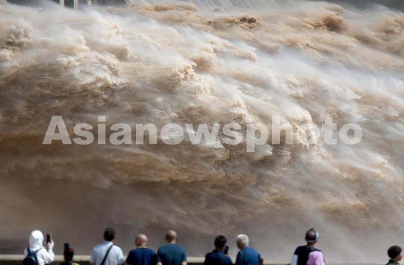 2023年7月5日,游客观看黄河小浪底水库排沙出库。