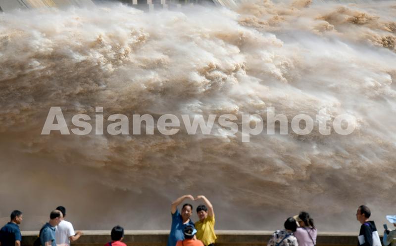 2023年7月5日,游客观看黄河小浪底水库排沙出库。