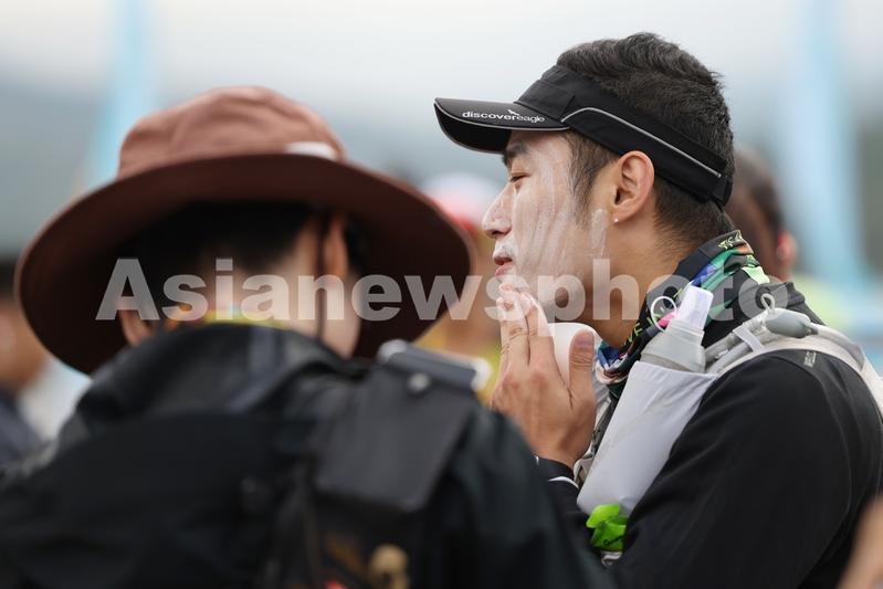 图片说明:2023年7月8日,50公里组,选手在出发前涂抹防晒霜。