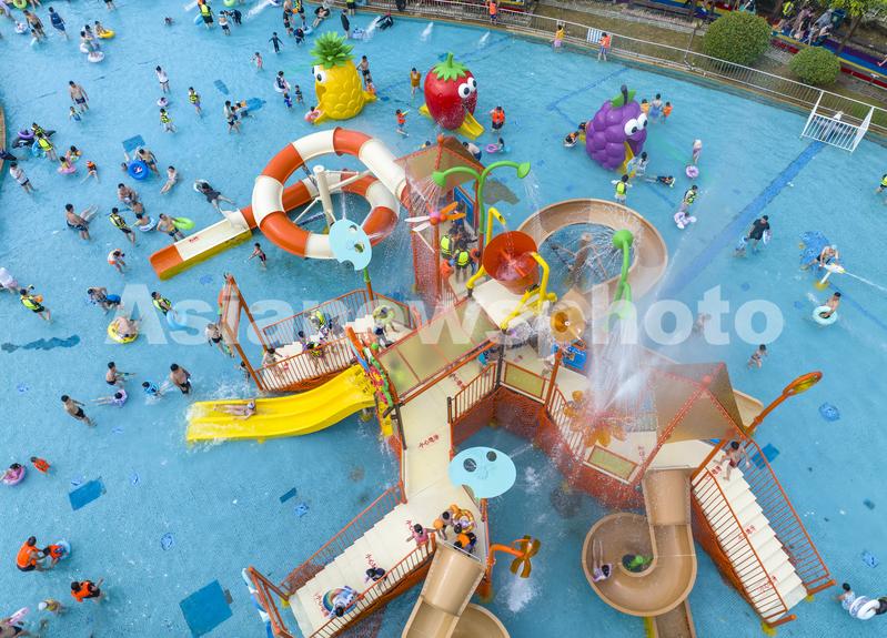 2023年7月8日,游客在安徽省芜湖市南陵县大浦乡村世界的水上乐园戏水游玩。(无人机照片)