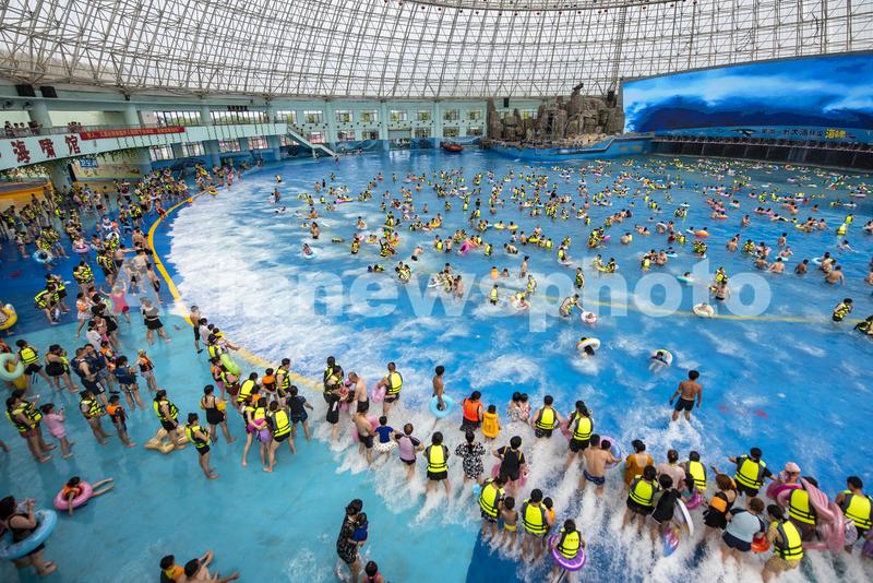 炎炎夏日,人们前往安徽省芜湖市南陵县大浦乡村世界的海啸馆和水上乐园,体验趣味水上活动,戏水消暑,享受清凉。