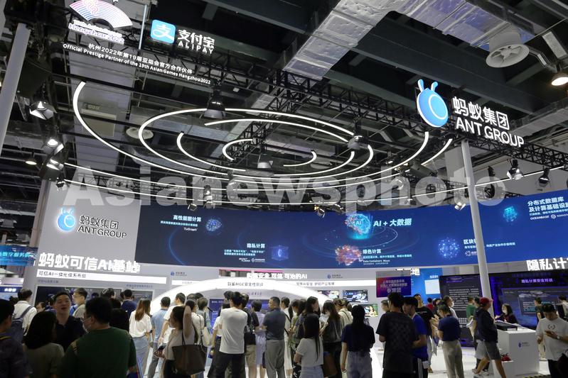 2023年7月7日,上海,蚂蚁集团携支付宝参展2023世界人工智能大会,展示可信AI基站、AIGC+元宇宙、AIoT区块链等领域开发成果,特别注明支付宝杭州2022年亚运会官方合作伙伴身份。