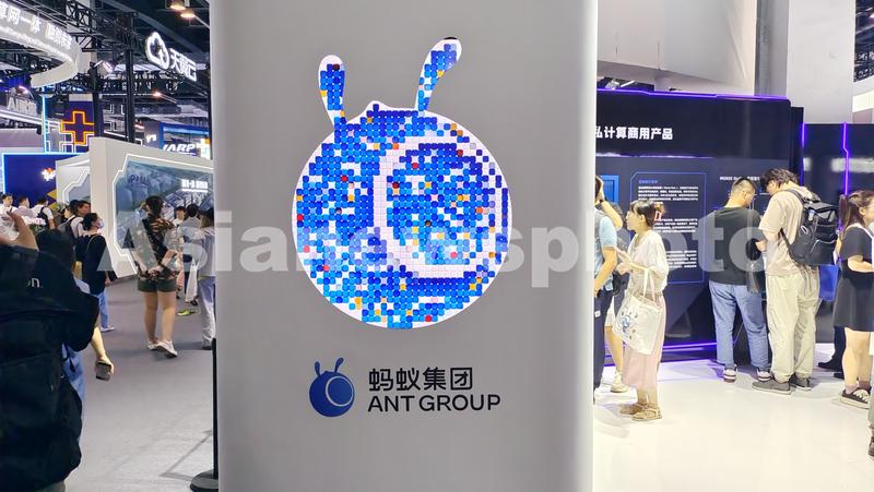 2023年7月7日,上海,蚂蚁集团携支付宝参展2023世界人工智能大会,展示可信AI基站、AIGC+元宇宙、AIoT区块链等领域开发成果,特别注明支付宝杭州2022年亚运会官方合作伙伴身份。