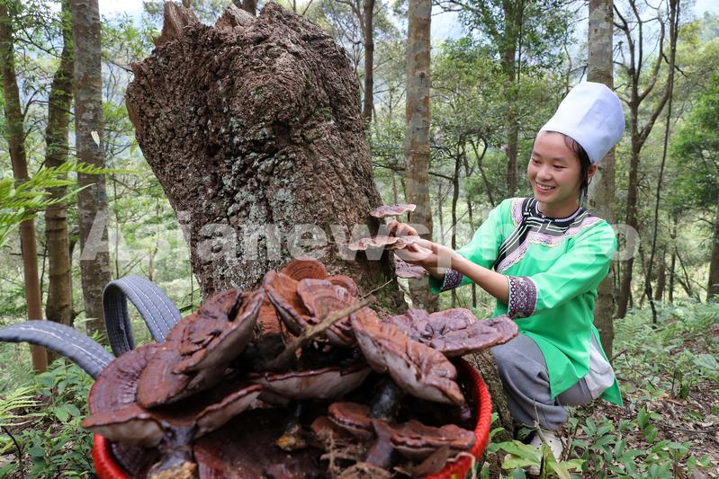7月11日,村民在贵州省黔东南苗族侗族自治州榕江县水尾乡拉术村灵芝种植基地采收灵芝。