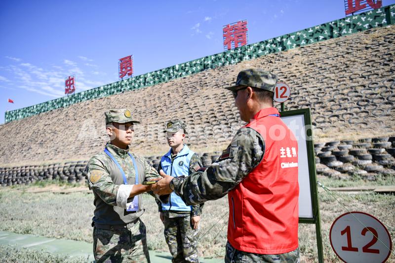 2023年7月12日,“锋刃-2023”国际狙击手射击竞赛现场,裁判为击中目标的队员赠送轩辕剑。(侯崇慧摄)