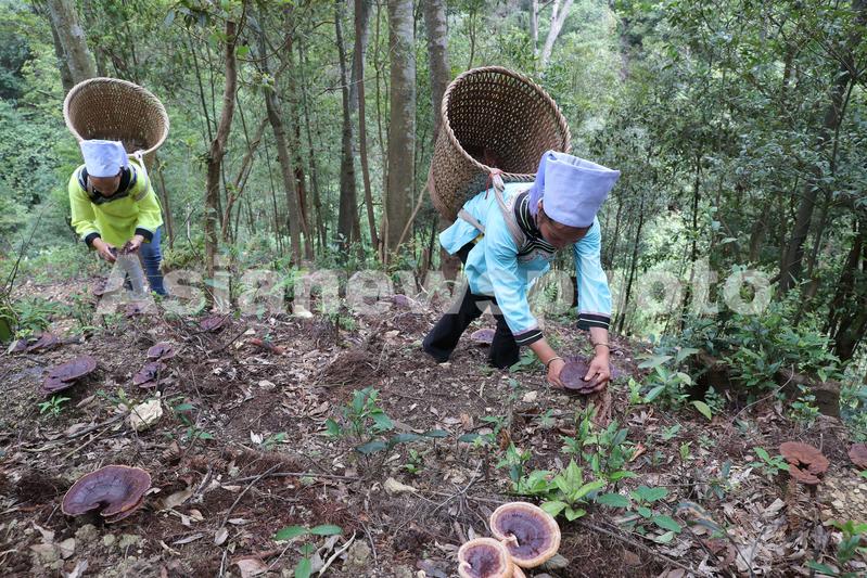 7月11日,村民在贵州省黔东南苗族侗族自治州榕江县水尾乡拉术村灵芝种植基地采收灵芝。