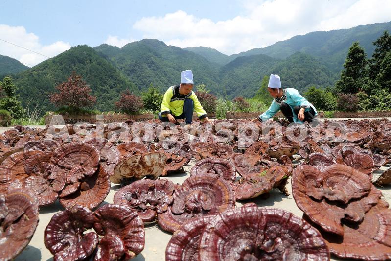 7月11日,村民在贵州省黔东南苗族侗族自治州榕江县水尾乡拉术村晾晒灵芝。