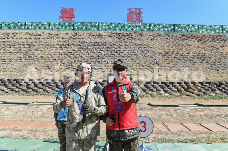7月12日,”锋刃-2023“国际狙击手射击竞赛在乌鲁木齐武警某训练基地开幕。图为裁判为击中目标的队员赠送轩辕剑。安晓惠 摄