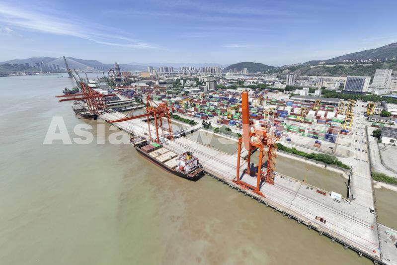 图片说明:2023年7月13日,位于福建省福州市马尾区的福州青州集装箱码头,泊位上的集装箱大型船舶正在进行吊装作业。