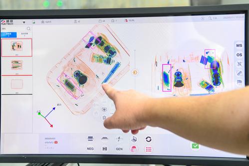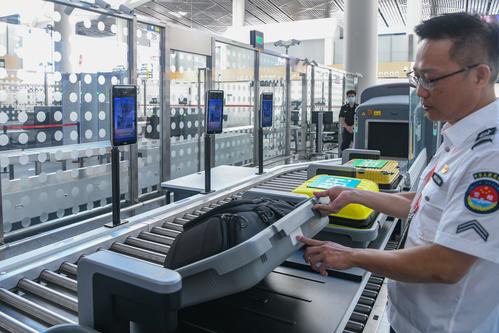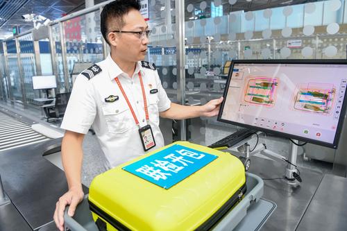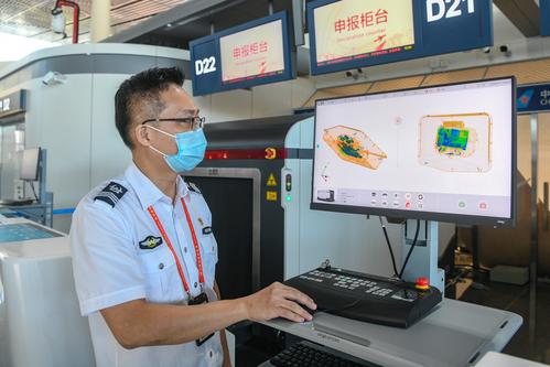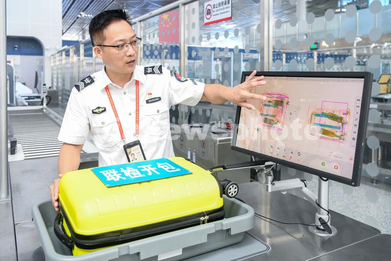 图片说明:2023年7月11日,在海口美兰国际机场封关运作项目现场,工作人员模拟异常行李查验。