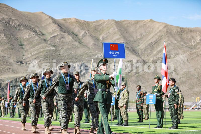 2023年7月12日,“锋刃-2023”国际狙击手射击竞赛在乌鲁木齐武警某训练基地开幕,图为中国武警参赛选手入场。侯崇慧 摄