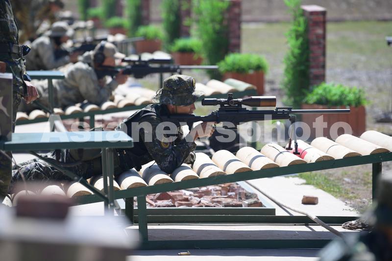 7月12日,”锋刃-2023“国际狙击手射击竞赛在乌鲁木齐武警某训练基地开幕。图为参赛选手进行多种姿势狙击课目竞赛。安晓惠 摄