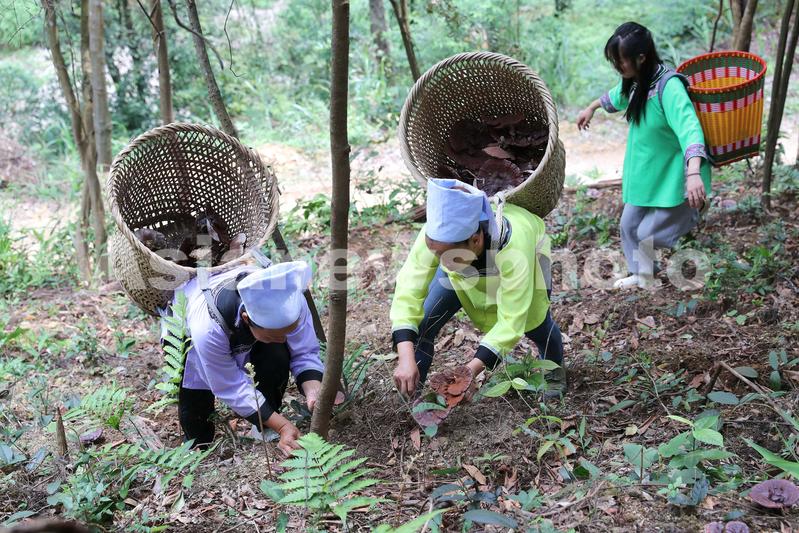 7月11日,村民在贵州省黔东南苗族侗族自治州榕江县水尾乡拉术村灵芝种植基地采收灵芝。