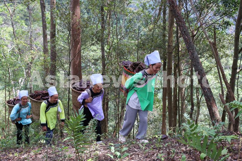 7月11日,村民在贵州省黔东南苗族侗族自治州榕江县水尾乡拉术村灵芝种植基地背运灵芝。