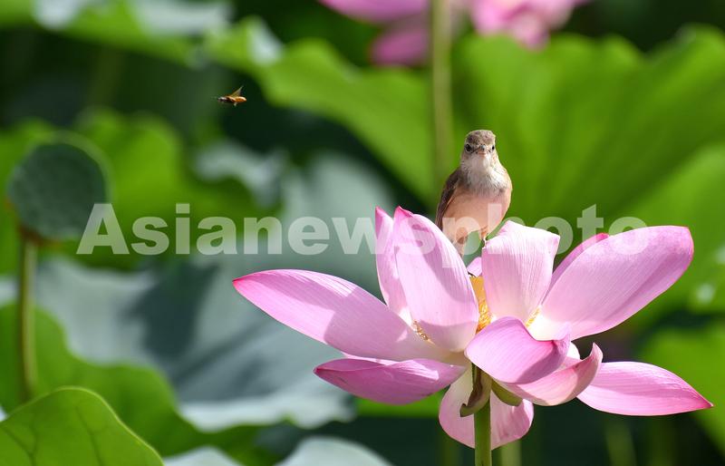 2023年7月14日,盛夏时节,河北省邯郸市龙湖公园荷塘里荷花竞相绽放,大苇莺在层层叠叠的荷叶中穿梭飞行、歌唱、觅食,呈现出夏日的诗画意境。