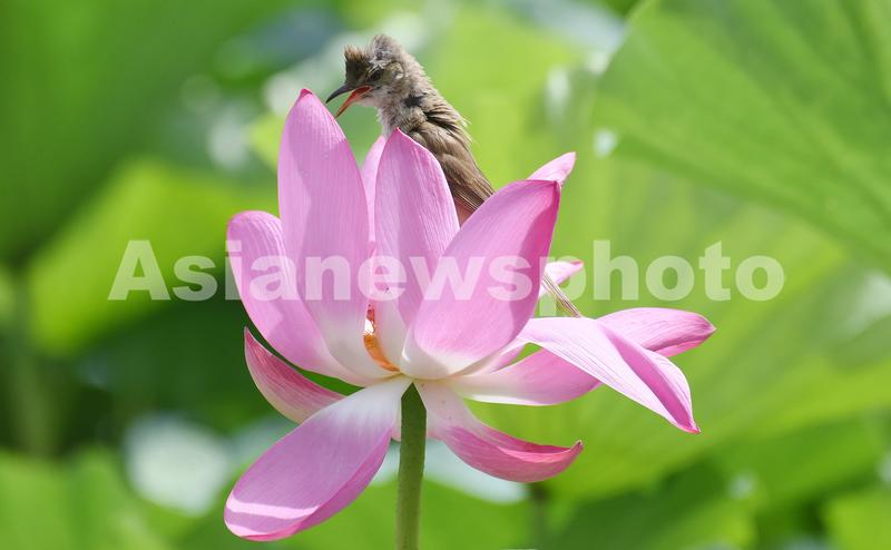 2023年7月14日,盛夏时节,河北省邯郸市龙湖公园荷塘里荷花竞相绽放,大苇莺在层层叠叠的荷叶中穿梭飞行、歌唱、觅食,呈现出夏日的诗画意境。