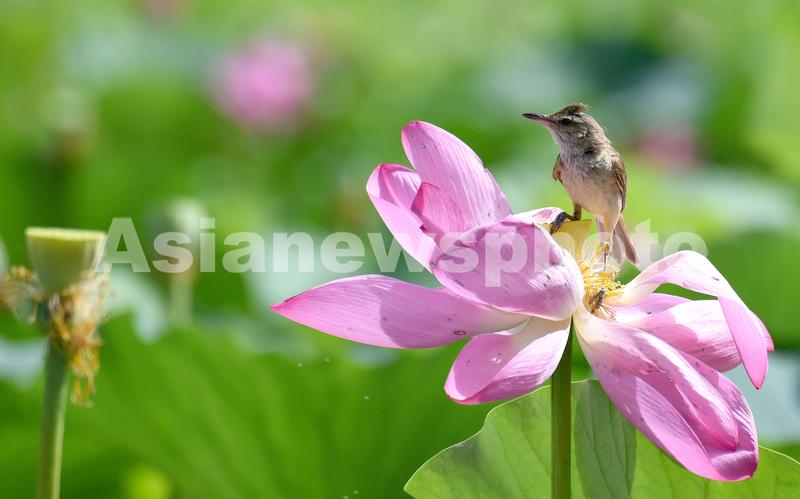 2023年7月14日,盛夏时节,河北省邯郸市龙湖公园荷塘里荷花竞相绽放,大苇莺在层层叠叠的荷叶中穿梭飞行、歌唱、觅食,呈现出夏日的诗画意境。