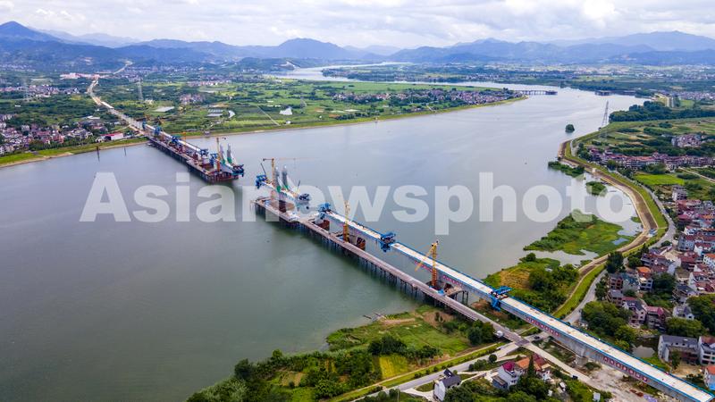 图片说明:2023年7月17日,浙江省金华市兰江水域,由中铁三局承建的金建高铁兰江特大桥正在进行梁部施工(无人机照片)。