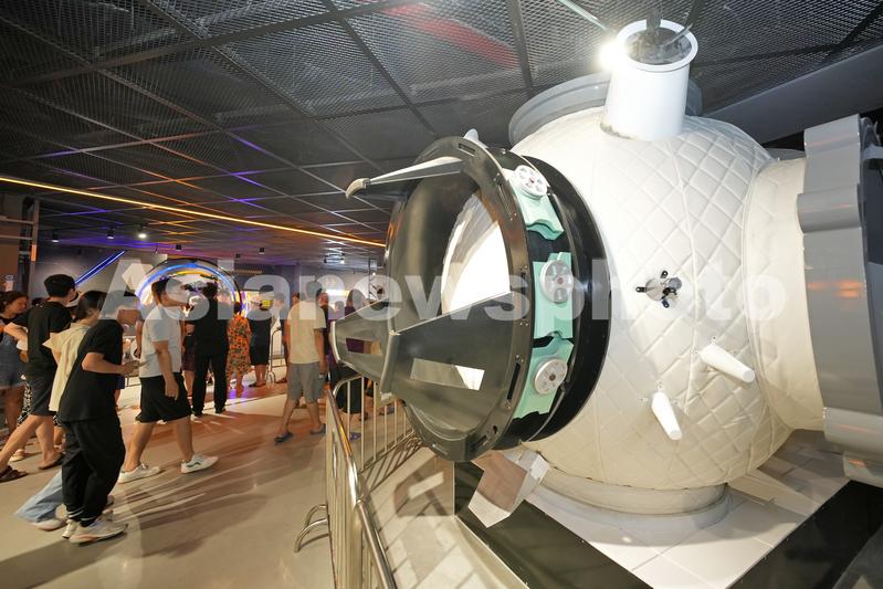 2023年7月15日,在山东海阳东方航天港航天科普教育基地,游客参观中国空间站天和核心舱模型。