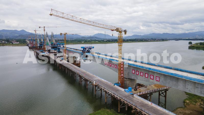 图片说明:2023年7月17日,浙江省金华市兰江水域,由中铁三局承建的金建高铁兰江特大桥正在进行梁部施工(无人机照片)。