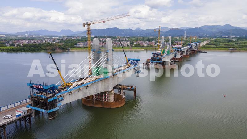 图片说明:2023年7月17日,浙江省金华市兰江水域,由中铁三局承建的金建高铁兰江特大桥正在进行梁部施工(无人机照片)。