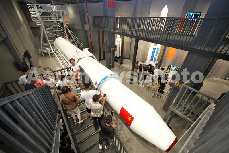 2023年7月15日,在山东海阳东方航天港航天科普教育基地,游客观看长征系列运载火箭模型。