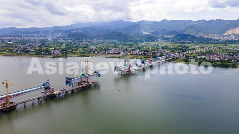 图片说明:2023年7月17日,浙江省金华市兰江水域,由中铁三局承建的金建高铁兰江特大桥正在进行梁部施工(无人机照片)。