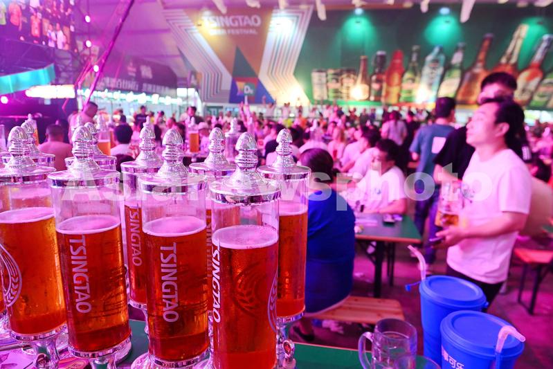 2023年7月16日,山东青岛金沙滩啤酒城,游客在啤酒大棚内饮酒狂欢。