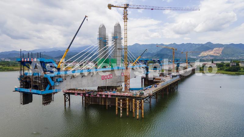 图片说明:2023年7月17日,浙江省金华市兰江水域,由中铁三局承建的金建高铁兰江特大桥正在进行梁部施工(无人机照片)。