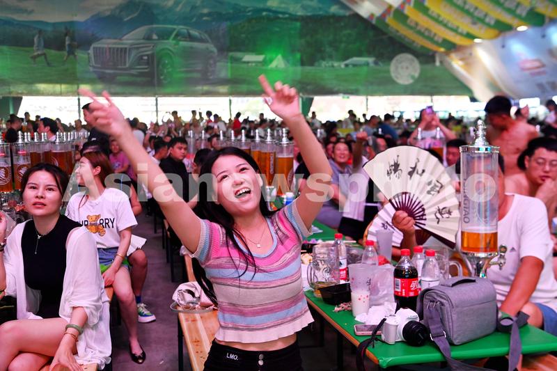 2023年7月16日,山东青岛金沙滩啤酒城,游客在啤酒大棚内饮酒狂欢。