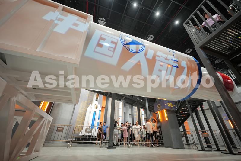 2023年7月15日,在山东海阳东方航天港航天科普教育基地,游客观看长征系列运载火箭模型。