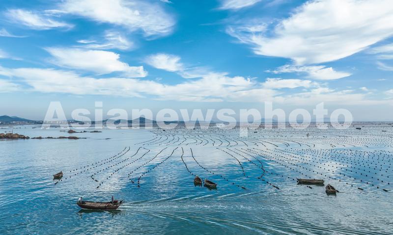 2023年7月17日,在山东省荣成市俚岛湾海域,渔民驾驶渔船在蓝天、白云倒影下的海洋牧场进行养殖作业,渔船似在云中仙境行驶,与大海、蓝天交相辉映,形成一幅大气磅礴、绚丽多姿的生态画卷。荣成市是国家级海洋经济发展示范区,全市海水养殖面积57万亩,拥有30多个养殖品种,形成鱼虾贝藻多品种、立体化的养殖格局。