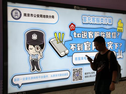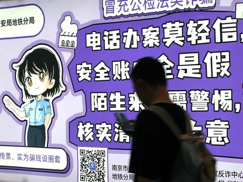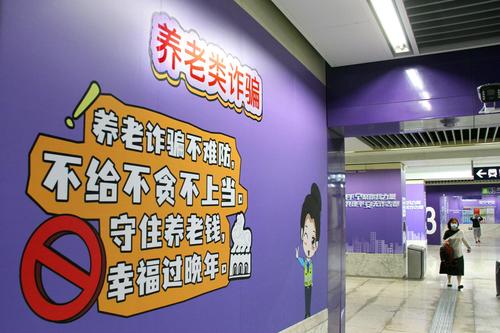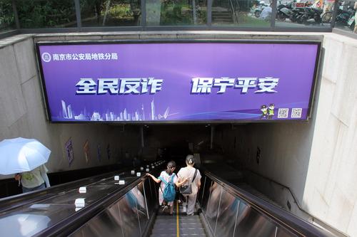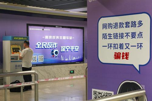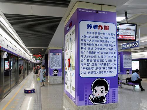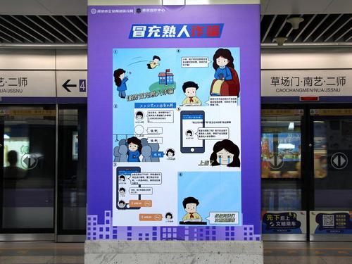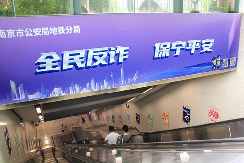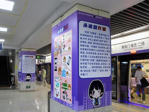 2023年7月12日,南京新亮相的反诈主题地铁站草场门站,站区内全覆盖布置了简明生动、针对性强的漫画图文和标语警句,充分利用地铁乘客候车的“碎片化”时间,普及反诈知识,宣传防范技巧,提高识别能力和防范意识。