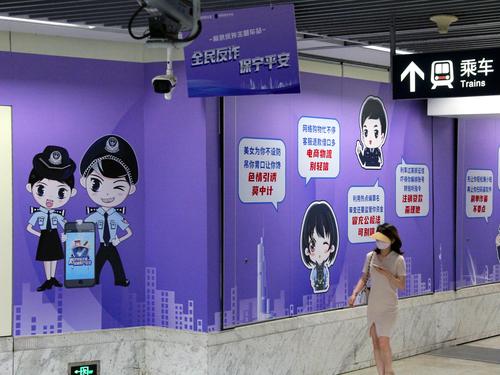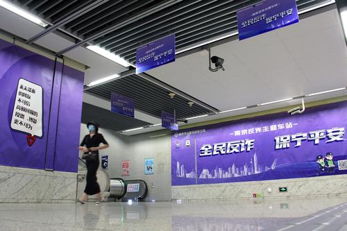 2023年7月12日,南京新亮相的反诈主题地铁站草场门站。
