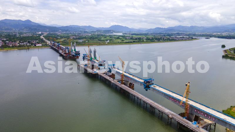 图片说明:2023年7月17日,浙江省金华市兰江水域,由中铁三局承建的金建高铁兰江特大桥正在进行梁部施工(无人机照片)。