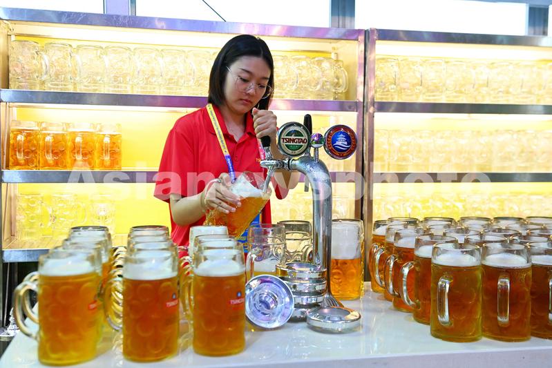 2023年7月16日,山东青岛金沙滩啤酒城,工作人员在给游客备酒。