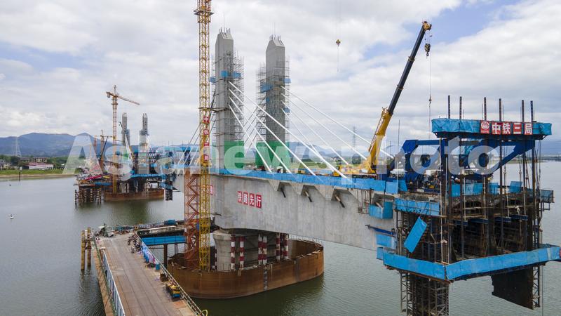图片说明:2023年7月17日,浙江省金华市兰江水域,由中铁三局承建的金建高铁兰江特大桥正在进行梁部施工(无人机照片)。