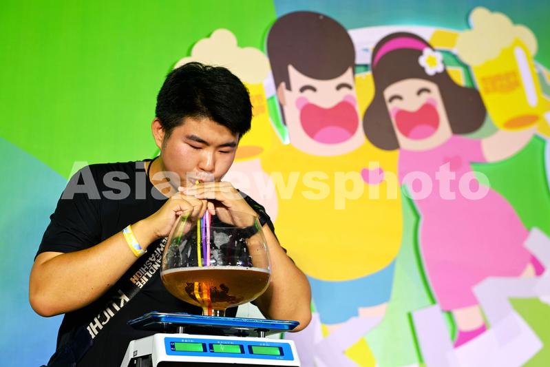2023年7月16日,山东青岛金沙滩啤酒城,一名选手在参加酒王擂台赛。