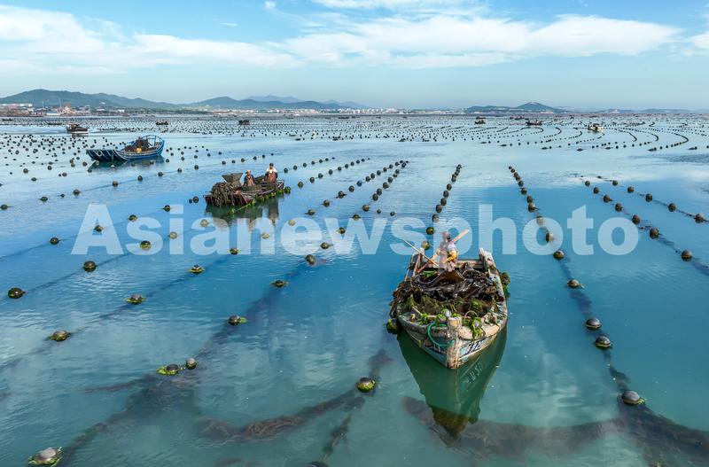 2023年7月17日,在山东省荣成市俚岛湾海域,渔民驾驶渔船在进行养殖作业。
