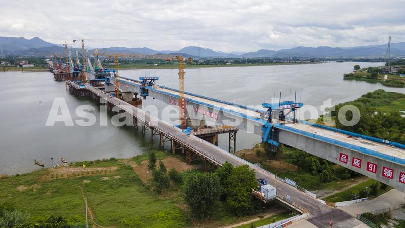 图片说明:2023年7月17日,浙江省金华市兰江水域,由中铁三局承建的金建高铁兰江特大桥正在进行梁部施工(无人机照片)。